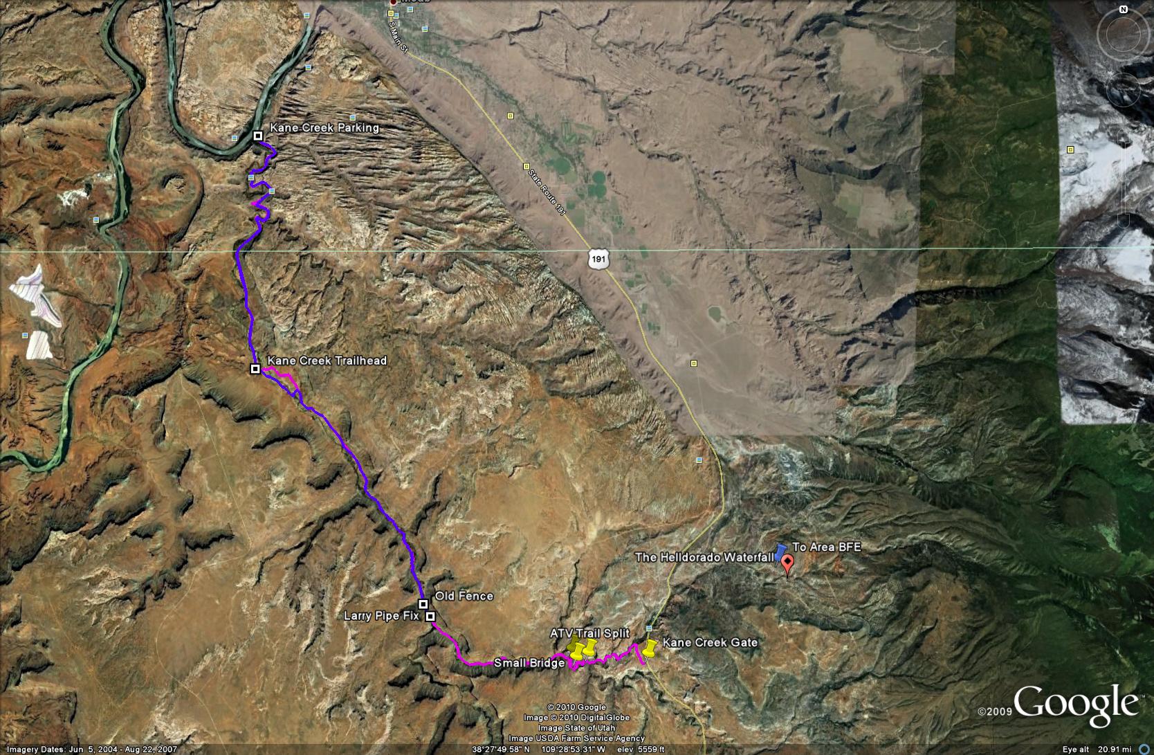 Description: Kane Creek is a LONG trail, especially on ATV as you must return to the start (unless someone is picking you up). The trail starts at the same place for Pritchett Canyon and Cliffhanger. You go down Kane Creek Road until you reach a sign for Kane Creek. Turn left, and you're off for the next 13 miles or so. The trail is fairly easy, with a few obstacles. It contains many creek crossings until you get to the big canyon. This is where the road gets tough up a hill, or you can go low on an ATV trail only. The road exits on Highway 191 south of Area BFE. The KMZ contains our tracks from 2007 and 2010. In 2007, we had to turn back after Larry's pipe broke. |