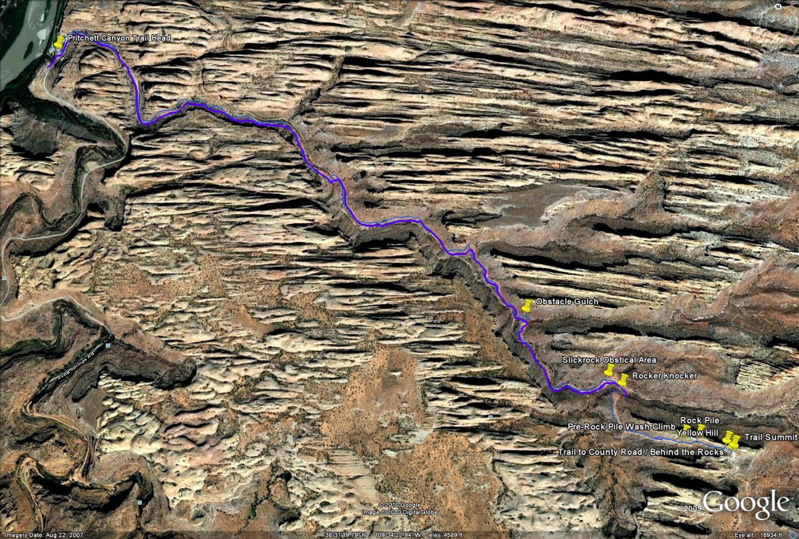 Description: Pritchett Canyon is as beautiful as it is evil. There are 2 extreme obstacles, Rocker Knocker and Rock Pile. There are several difficult sections besides those 2 extreme sections. This trail is a workout. If you are REALLY ambitious, you can do Pritchett Canyon and ride over to Behind The Rocks and do that too. But I would estimate that is 40+ miles round trip. Definitely an ALL DAY thing. This KMZ contains are partial tracks from 2007. We went up Rocker Knocker and turned around as we ran out of light. |
